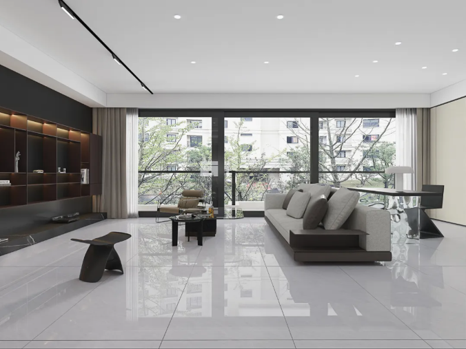 充满美感的尼克米白运用在客厅中,搭配灰色的布艺沙发和利落的线条感,既丰富了空间的视觉层次,又能让每个角落都能感受到宁