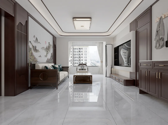 棕色的软装、独特的电视背景墙,凸显精致、现代又简约的质感。地面铺贴鼓浪灰,纹理连贯大气,层次感丰富分明,加深了整体空